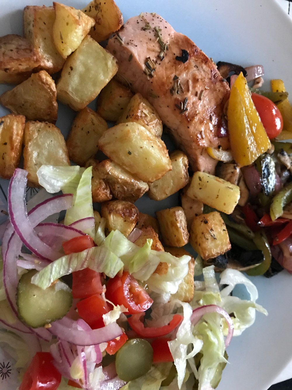 - Check that your fish is fully cooked and remove the skin before serving. Add your pan seared veggies and potatoes to your plate and then serve.